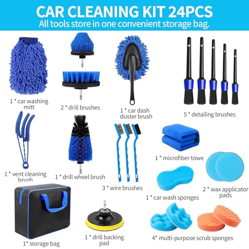 24 PCS Car Cleaning Kit, Car Washing Brush Kit with Drill Brushes, Ultra Soft Car Detailing Brushes, Professional Car Care Accessories for Interior, Exterior, Wheels, Car Care Gifts for Women/Men