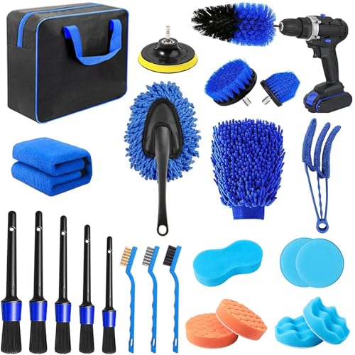 【PROFESSIONAL CAR CLEANING KIT】The all-round car detailing kit equipped with 5 * detailing brushes, 2 * drill brushes, 1 * drill wheel brush, 3 * wire brushes, 1 * vent cleaning brush, 1 * car dash duster brush, 1 * car washing mitt, 1 * drill backing pad, 4 * multi-purpose scrub sponges (drill or hand Use), 2 * wax applicator pads, 1 * microfiber towel, 1 * car wash sponges, 1* storage bag. Excellent completion of all works required for external and internal details! A gift for car buffs.