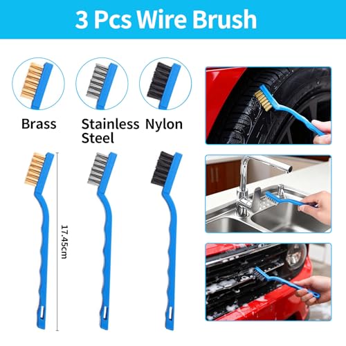 【MULTIPLE CAR CLEANING BRUSHES】5 different sizes car detailing brushes tackle small cracks, corners, lug nuts, vents, seats, engine bays, dashboards, and more. 3 wire brushes (1 stainless steel, 1 brass, 1 nylon) suit all surface types. The ergonomically designed vent brush cleans air vents easily. Car Dash Duster easily operated and fits comfortably in the hands. Microfiber Wash Mitt absorbs 7x its weight in water,internal waterproof design, elastic wrist cuff keeps mitt in place on hand.