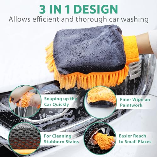 [3-in-1 Wash Mitts for Car Washing] – The 3-in-1 design car wash mitts allow efficient and thorough car washing. The densely chenille noodles hold 10x its weight in soap and water, and quickly spread it out on large area; The soft microfibre side is ideal for finer wipe on paintwork; The mesh surface on the sides provide stronger mechanical cleaning for stubborn stains on rims, alloy wheels. Mixed with the dexterity of the hand, the washing mitts allow easier access to small spaces like alloy wheels, wing mirrors and many other awkward angles around the car.