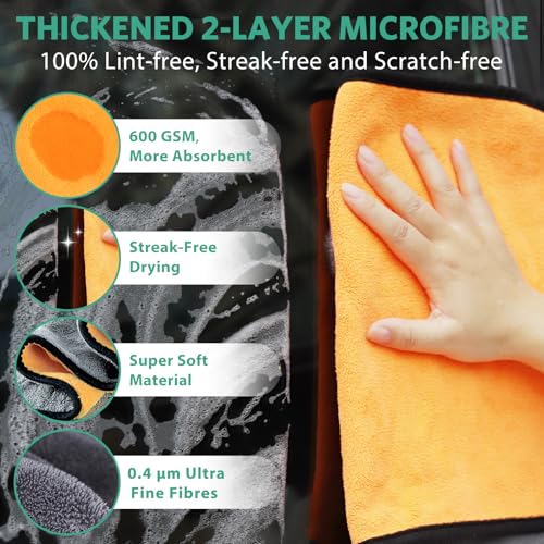 [Thickened 2-Layer Car Microfibre Cloths] – Compared to these 500 GSM(g/m2) microfibre cloths, our 600 GSM ones are more absorbent, perfect for 100% lint-free and streak-free drying after car washing. The 0.4 μm extremely fine fibres do a good job catching particles, making it ideal for dusting interior and waxing/polishing the car. The car drying towels measures 40 x 30 cm, the just right size for comfortable holding.