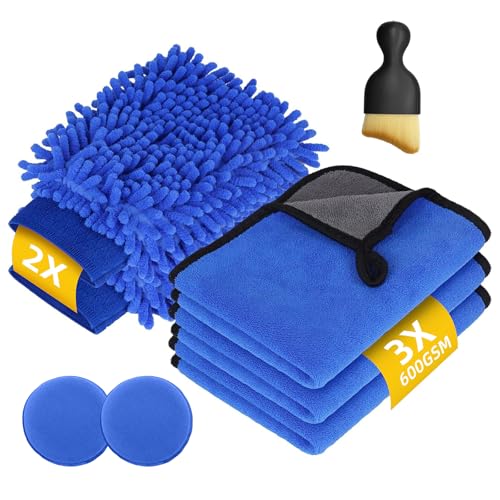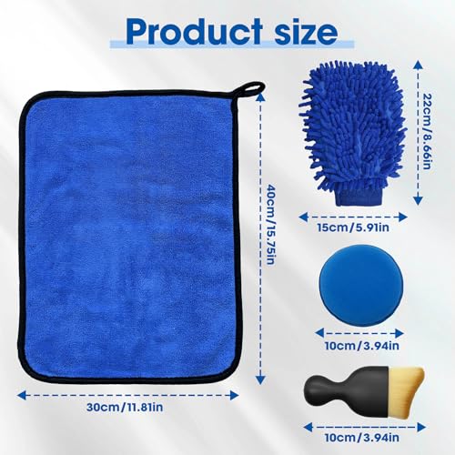🚗【Excellent quality car cleaning kit】Including 2 car wash mitts, 3 microfibre cleaning cloths, 2 waxing sponges and 1 ultra-soft car interior detailing brushes. The sets ensure effective cleaning of the interior and exterior of the car without leaving any scratches, cotton wool, or stripes.