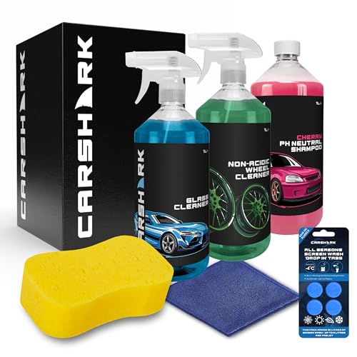 Comprehensive Gift Set: This box contains a 1L Cherry Shampoo, 1L Wheel Cleaner, 1L Glass Cleaner, a Sponge, a Microfibre Cloth, and a pack of Screenwash Tabs.