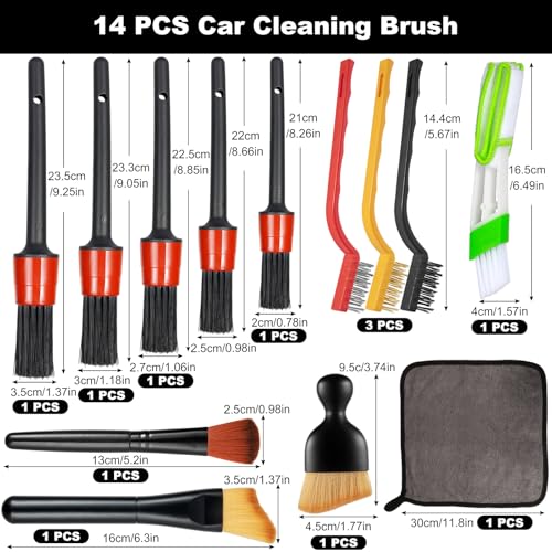 【14 PCS Car Detailing Kit】 Package includes 5 different sizes of detail brushes, 2 Soft delicate cleaning brushes , 3 steel wire brush, and 1 nylon brush, 1 duster Rag, 1 long handle cleaning brushes,1car detailing brush,You can choose the appropriate brush to meed your different needs.