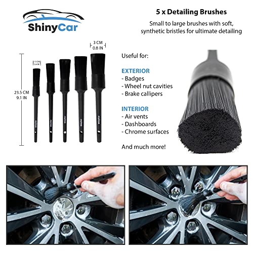 5 x Professional Detailing Brushes – Small to large brushes with high-density, non-scratch synthetic bristles for supreme detailing of all wheel types. Great for getting into tight spots such as wheel nut cavities, brake callipers, centre caps, inner rims & other poorly accessible gaps. They can also be used to detail chrome surfaces, & remove dirt/ dust from air vents, dashboards, badges & inner doors. For complete interior & exterior use to achieve that new automotive look (for cars, vans, trucks, caravans & motorbikes).