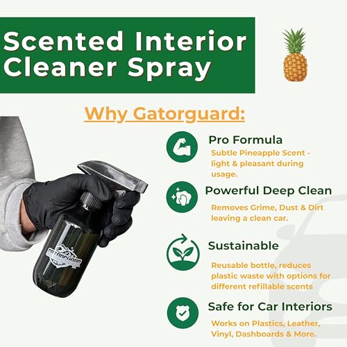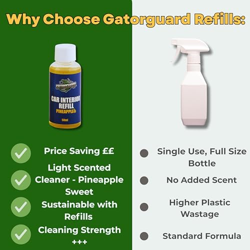 ECO-FRIENDLY CLEANING POWER: Transform your car with the Gatorguard Starter Kit—includes a 50ml Light Pineapple-scented refill, 300ml reusable spray bottle, and microfibre cloth. Our dilutable concentrate delivers a powerful clean while reducing plastic waste, perfect for eco-conscious drivers.