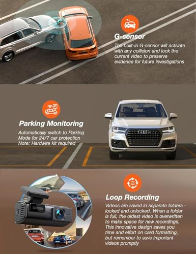 【G-Sensor & Loop Recording】The dashcam’s adjustable G-sensor detects sudden collisions and automatically locks and saves relevant video clips in the “Lock” folder, making evidence retrieval quick for claims. Loop recording ensures continuous video recording, with old videos being automatically overwritten when the storage space is full, efficiently managing storage space. (But please remember to save important videos promptly to avoid them being overwritten).