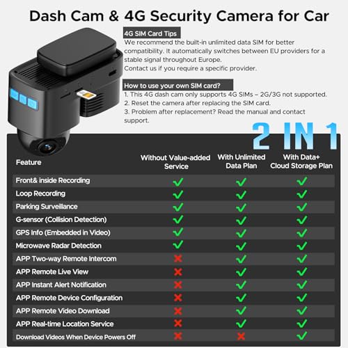 【Reliable 4G LTE Connected Dash Cam】The cellular dashcam turns any vehicle into a smart security hub. With 4G LTE, AI human detection, microwave radar, and real-time GPS, it enables remote monitoring without WiFi. Ideal for fleets, rideshare, urban parking, and teen drivers. Supports remote live view, alerts, and evidence via the uboxPro app. (Note: Remote features require a cellular subscription after the trial; Cellular plans: averaging only £0.25 per day; Local SD recording works without a subscription.)