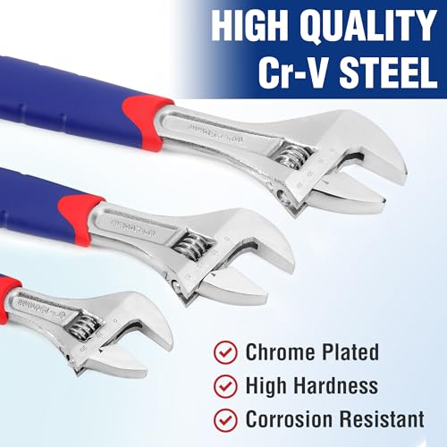 Robust and Durable: WORKPRO adjustable wrench set are made of high quality chrome vanadium for durability and rust resistance. Chrome plating on the surface for good wear resistance