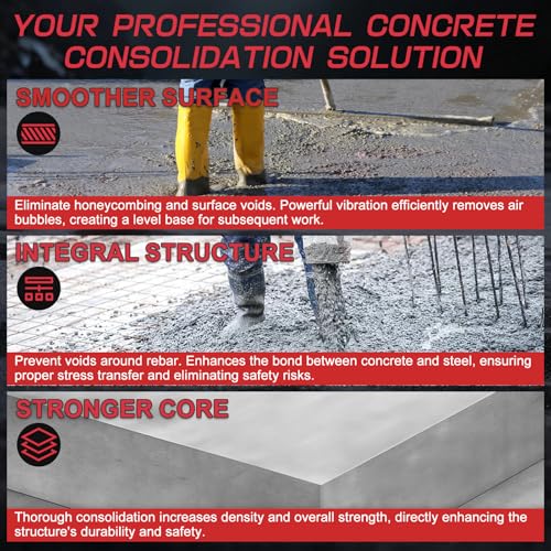 Ideal for Multiple Concrete Applications: Perfect for tamping poured ring beams, concrete pedestals, and foundations, this cement vibrator removes air pockets, enhancing concrete density and saving material. It ensures an even pour over rebar, improving the overall strength of your structure