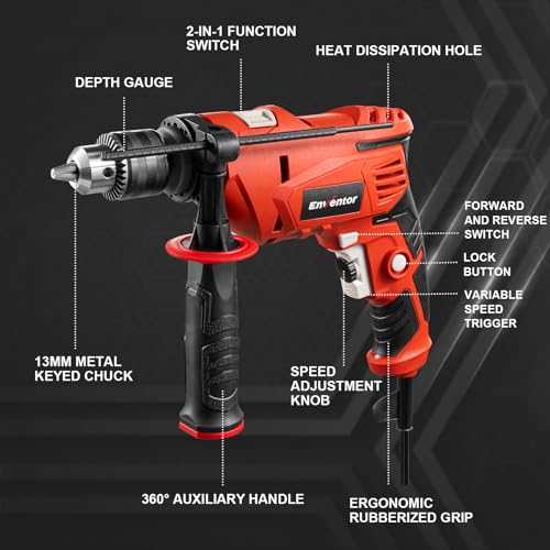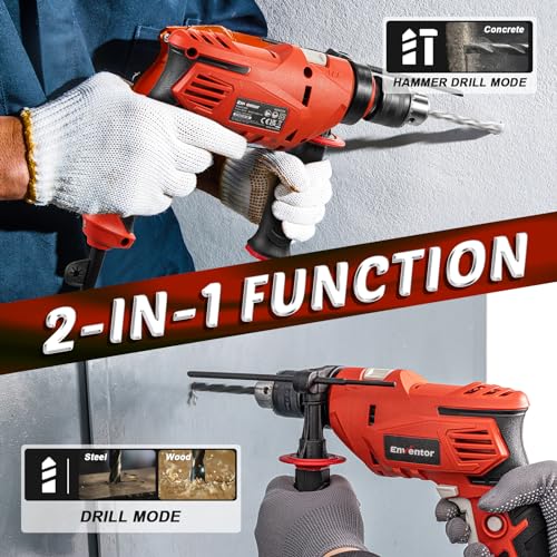 Enventor Hammer Drill, 900W 0-3000RPM Electric Corded Hammer Drill, Variable Speed, 13mm Chuck, 360° Auxiliary Handle, with 36pcs Accessories for Concrete, Iron Plate, Masonry and Wood