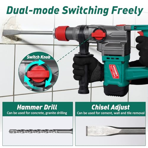 【Safety & Comfort】 Our hammer drill is designed with a safety clutch and vibration-absorbing handle, ensuring safe and comfortable operation. Precision steel gears and precise cylinder provide smooth and reliable performance. Automatic safety clutch system stops drilling when hitting reinforcing bars, preventing overdrilling and potential hazards.