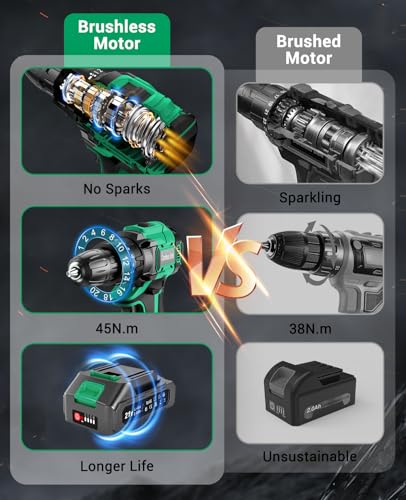 【Superior Brushless Motor】FEBOGER brushless cordless drill has a maximum torque of 45N.m. With its increased torque and speed, you can easily handle tough materials. It also has a longer lifespan, less maintenance, and quieter operation than regular brushed motors, making it ideal not only for home DIY, but especially for professionals.