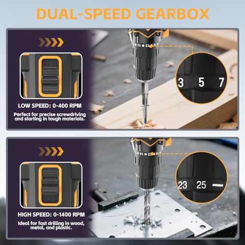 Versatile Drill & Driver Modes:Switch between two optimised speeds on this electric drills cordless: 0-400 RPM for screw-driving and 0-1400 RPM for drilling. This drill driver handles everything from softwoods to tough metals