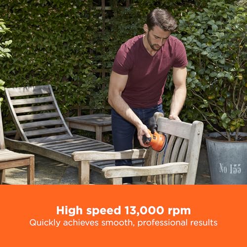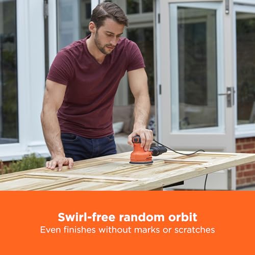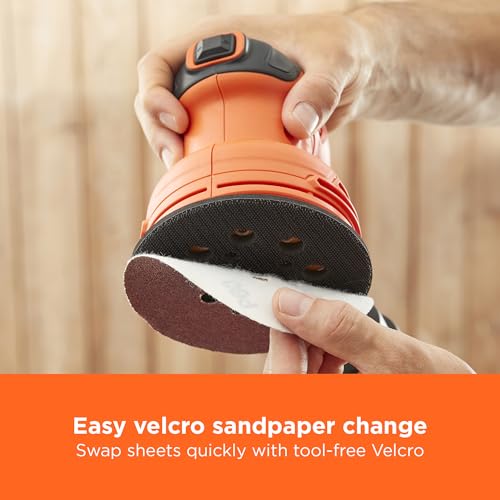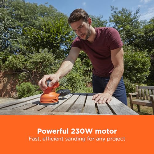 FAST, SMOOTH SANDING FOR ANY SURFACE: The BLACK+DECKER 230W Random Orbit Sander delivers quick, professional-quality results on wood, metal, and PVC—its powerful motor, swirl-free finish, and easy-to-use design make it the ideal tool for effortlessly achieving smooth surfaces and tackling a variety of home projects.