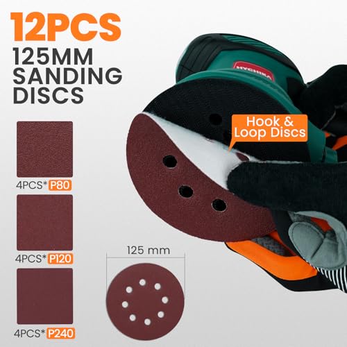 Includes 12 pieces of 125mm sanding discs (P80, P120, P240) and features a Hook & Loop quick-change design for easy and fast disc swaps