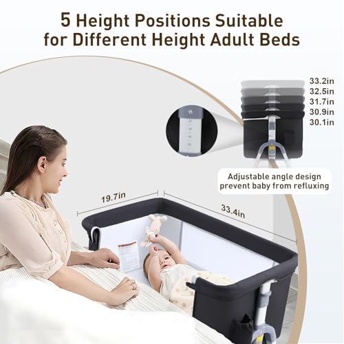 5 Height Adjustable Design: The baby crib has a scientific five-position adjustment level to suit different bed height. And the side zipper design of the bedside cot gives mom and baby the closeness and convenience of co-sleeping that allow you to tend to baby without leaving your bed