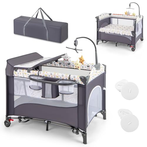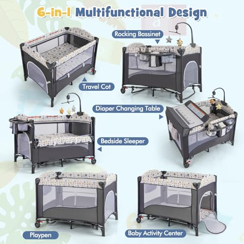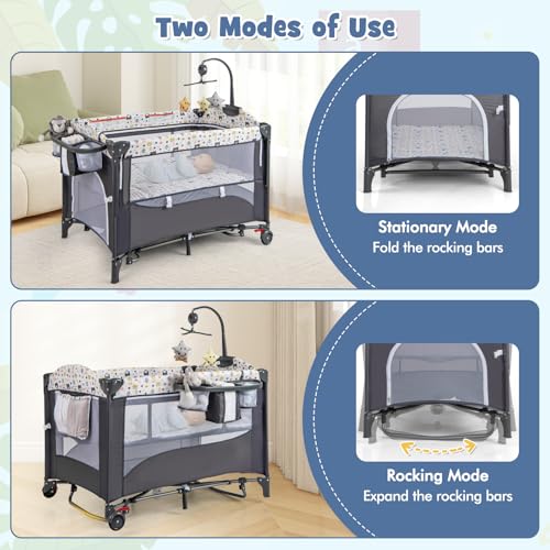 6-In-1 Design: The baby cot can become a travel cot for sleeping, a rocking bassinet for soothing sleep, a bedside sleeper for convenient night care, a changing table for easy diaper changes, a playpen or a activity center for daily simple playing. Besides, the top music boxes and hanging toys can catch the baby’s eye well and soothe the baby’s mood.