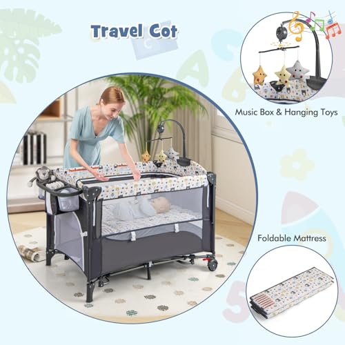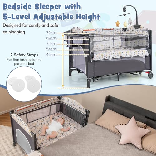 6-in-1 Baby Travel Cot, Infant Bedside Sleeper with Detachable Changing Table, Music Box and Hanging Toys, Adjustable Nursery Center for Newborn Toddlers (Bear)