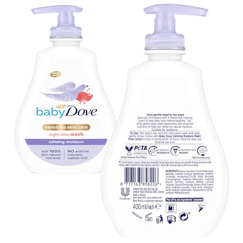 FROM TIP TO TOE: Baby Dove Calming Moisture Baby Wash & Lotion is specially formulated with a calming chamomile scent to help baby relax before bedtime. Baby Dove Calming Nights Lotion is a gentle baby lotion that soothes dry baby skin from the first use
