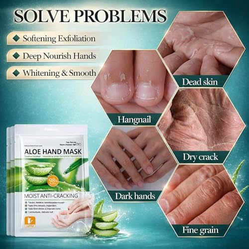 ✨[Moisturising Relief for Dry, Tight Hands] These aloe hand mask gloves are created for people experiencing dryness or tightness from frequent washing or household tasks. Infused with botanical-based ingredients, including aloe vera, they help the appearance of skin and discomfort. The moisture-rich formula coats hands inside the gloves, making them feel more comfortable, smoother, and soft after use, especially when applied before bed or after cleaning.