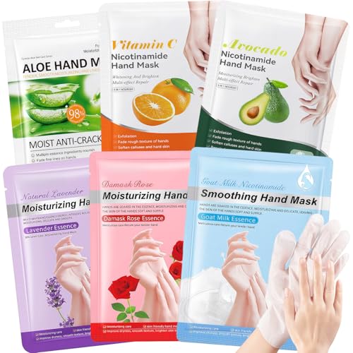 6PCS Hand Moisturizing Mask with Serum – Hydrating & Repairing Gloves for Dry Hands, Infused with Milk, Rose, Aloe Vera, Avocado, Lavender & Vitamin C – Nourishing, Softening & Exfoliating