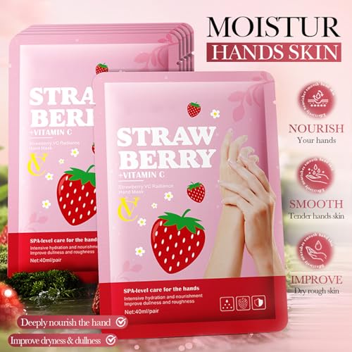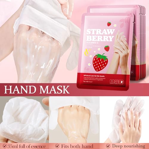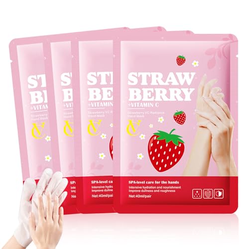Strawberry Hand Mask Gloves, Moisturizing & Exfoliating Hands Skin Repair Mask with Vitamin C Essence, Nourishing Softening Hand Care Gloves for Dry, Rough and Cracked Skin (4PCS)