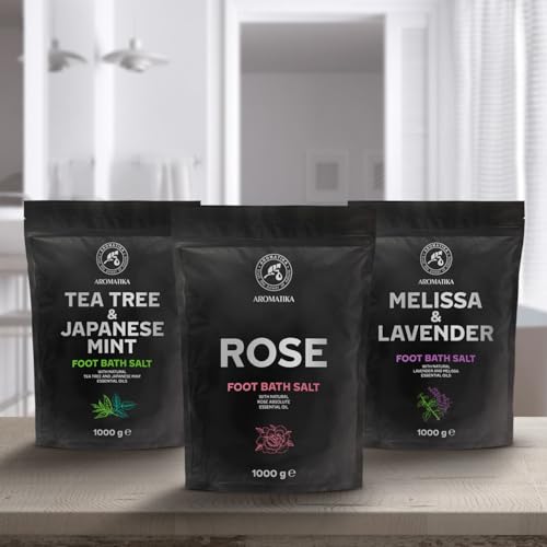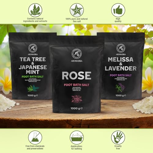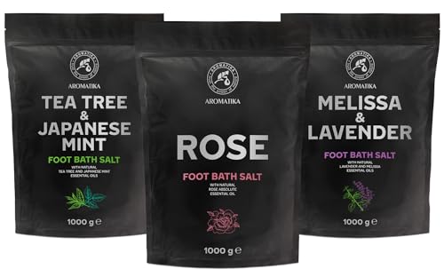 Foot Bath Salt Set – Melissa, Lavender, Tea Tree, Japanese Mint & Rose – 3x1000g – Natural Sea Salt for Foot Soaks and Pedicures – Relaxing Scented Bath Salt – Home Spa Foot Care