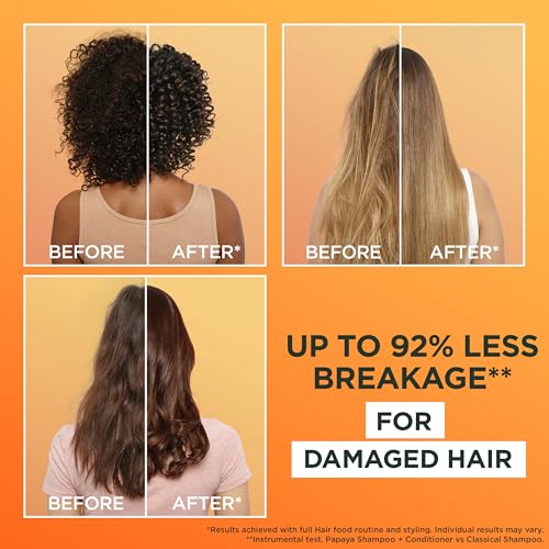 Experience hair repair with Garnier Ultimate Blends Papaya Hair Food Mask, formulated to transform your hair from the first use. In just 1 use, its supercharged formula boosted by vitamins C, E, F* repairs your hair, leading to up to 94% less breakage**. Designed tested & approved for all hair types, including type 4 curls and coils. To unlock optimal results, we recommend using this mask in a complete hair care routine. The best benefits are achieved when used as a full routine with Garnier Hair Food Papaya Shampoo and Conditioner. 4/5 agree hair is the healthiest it’s ever felt*** This mask contains 97% natural origin ingredients and a vegan fomula****, blended with beneficial Papaya extract. Contains no silicones for a natural feel. This mask is Cruelty-free International approved. *Vitamin C and F derivatives **High repetition, instrumental brushing test vs classical shampoo on bleached hair ***Home Tester Club, 99 out of 117 agree ****No animal-derived ingredients or by-products