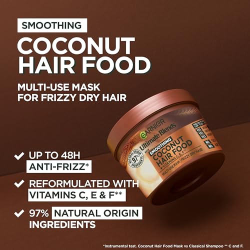 Contents: 1x Garnier Ultimate Blends, Hair Food Coco-Macadamia 3-in-1 Hair Treatment Mask, For Frizzy & Curly Hair, Vegan Formula, Volume: 400ml