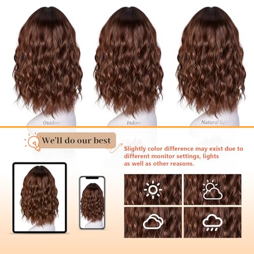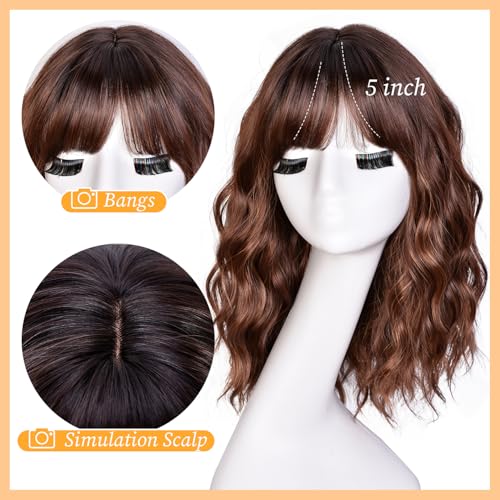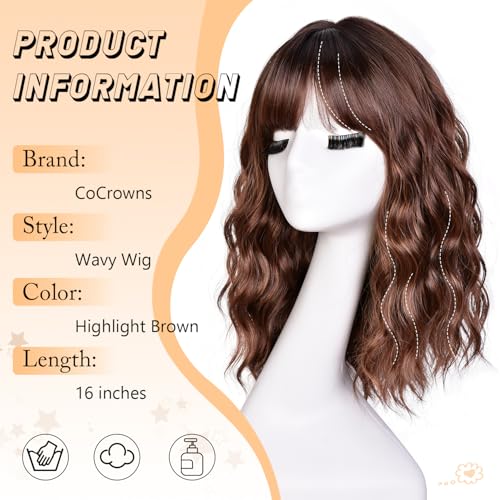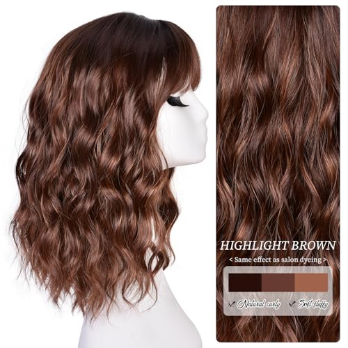 Short Bob Wavy Wigs for Women 18Inch Wig with Bangs for Black Women Shoulder Length Bob Hair Style for Halloween& Cosplay and Daily (Highlight Brown)