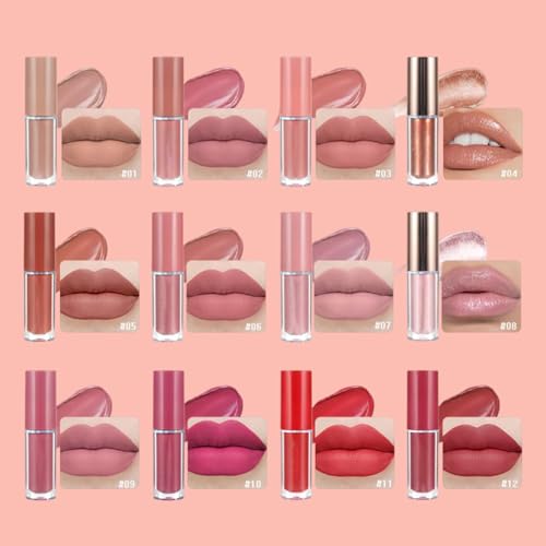 12 Colors Nude Liquid Lipstick Makeup Set Matte Velvet Non-Stick Cup Not Fade Long-Lasting Waterproof Pink Lip Gloss High Shine Lip Plumping Glass Finish Lipstick Set Gift Kit For Women