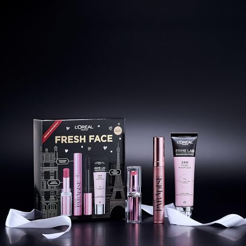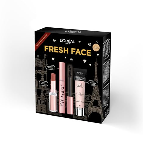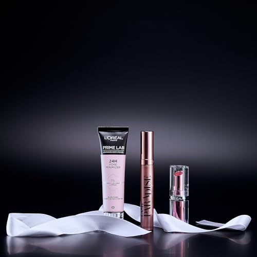 L’Oréal Paris Fresh Face Primer, Lipstick & Mascara Trio Gift Set Prime Lab 24H Pore Minimiser Primer, Hydrating Balm-In-Lipstick In 191 Nude Heaven & Lash Paradise Mascara Enriched With Castor Oil