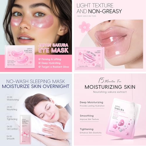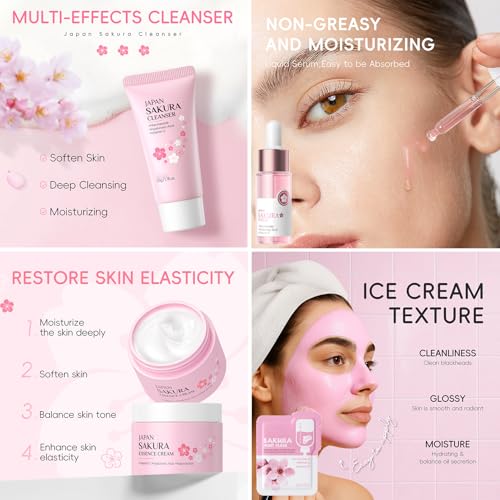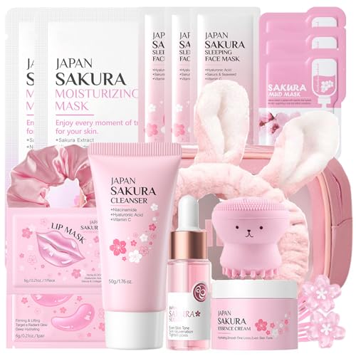Skin Care for Teenage Girls, Sakura Facial Skin Care Sets & Kits, Complete Gifts for Women with Cleanser, Serum, Sleeping Mask, Mud Mask, Eye Mask, Face Cream, Brush, Headband, Hair Clip&Tie, 19PCS