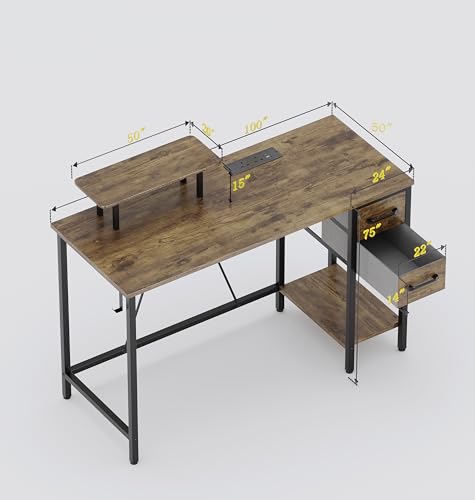 Computer Desk with Drawers & Power Outlets, 100 cm Office Desk with Storage Monitor Stand, Reversible Small Desks for Home Office Bedroom Brown
