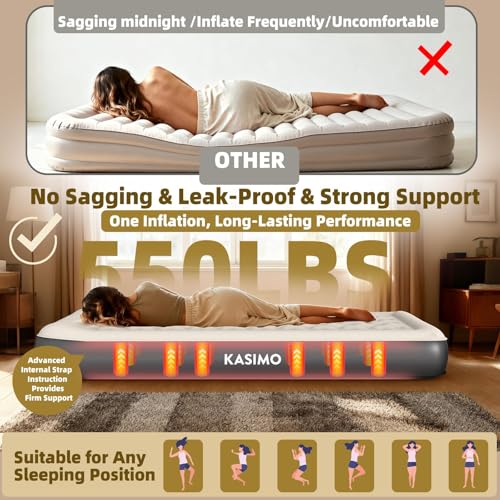 Innovative Internal Structure – Unbeatable Support & Lasting Comfort: Say goodbye to saggy, unstable air mattresses! KASIMO ’s advanced internal strap system delivers real-bed comfort with ergonomic support that hugs your body and evenly distributes weight all night long. Hold up to 550 lbs with reinforced air retention technology for superior stability. Even at just 8.7 inches/22cm height, our Inflatable Mattress stays firm and flat—preventing sinking, sagging, no sliding, just deep and relaxing sleep. Wake up refreshed, no back pain, and ready to conquer the day!