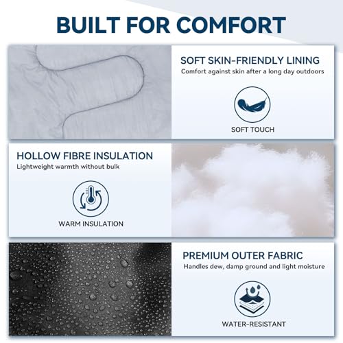 COMFORTABLE SLEEP: Enjoy a cosy night’s sleep with a soft-touch lining and reliable hollow fibre insulation that balances warmth and breathability. With a generous 220 x 75 cm size, this lightweight sleeping bag provides ample space to stretch out and relax. Whether you’re camping under the stars or in a family tent, it offers full-body comfort for both adults and children, kids. The soft inner lining is kind to the skin, offering comfort that appeals to both beginners and seasoned campers