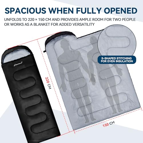 VERSATILE USE: More than just a sleeping bag, this wide design fully unzips to lay completely flat – transforming into a large blanket measuring 220 x 150 cm. Whether you’re relaxing at a picnic, adding an extra layer in your tent, or sitting around the campfire, it’s ready to adapt. Ideal for girls, boys, and campers who value flexibility and multi-use gear, this 3 season sleeping bag offers warmth, space, and convenience in every setting—without taking up extra room in your pack
