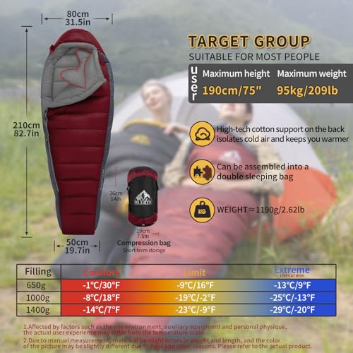 WARM AND LIGHTWEIGHT – Down sleeping bag filled with 650g of down. Made of RDS certified traceable down, no odor, no impurities. With excellent warmth and breathability, fill power up to 680FP. Comfortable temperature range is -1℃ to -13℃. Perfect for cold weather outdoor camping for adults.