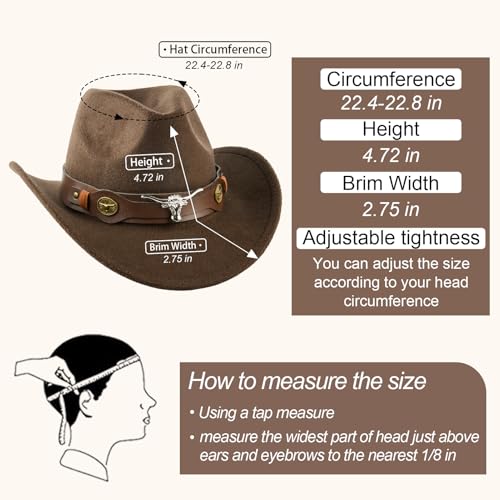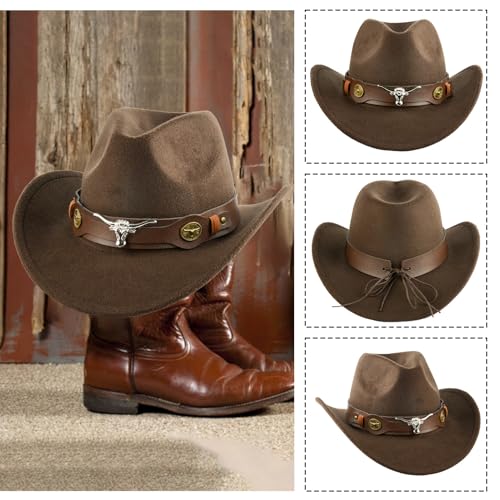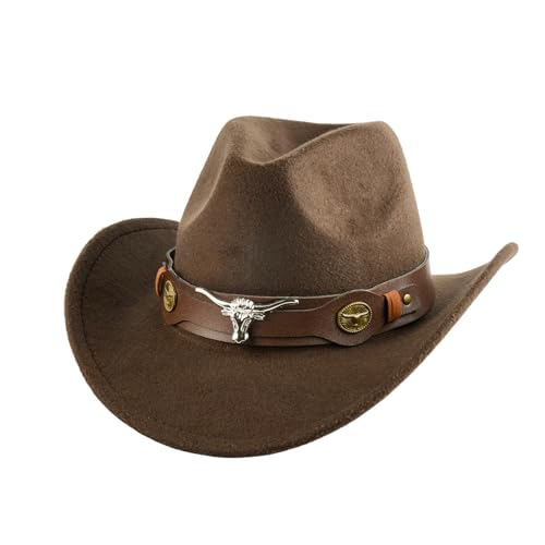 Cowboy Hat for Men and Women with Rolled Brim Fall Winter Peach Heart Crown Wool Hat Adjustable Drawstring Fashionable and Stylish, Coffee Cowboy Hats