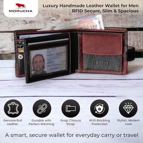 MORUCHA RFID Blocking Genuine Leather Wallet for Men – Slim Bifold Bull Leather Wallet with Coin Pocket, ID Window, 8 Card Slots – Premium Black/Brown Luxury Gift Box (Model #M75)