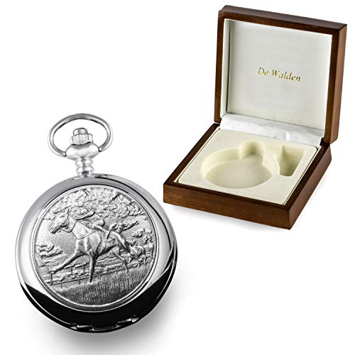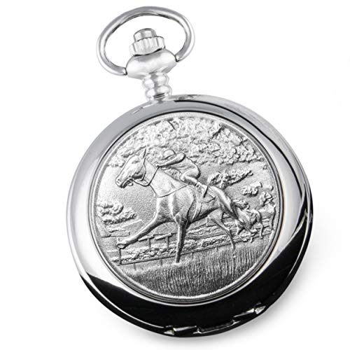 Fully Engraved Pocket Watch with Solid Pewter Horse Racing Feature Case Front in a Quality Wooden Presentation Box