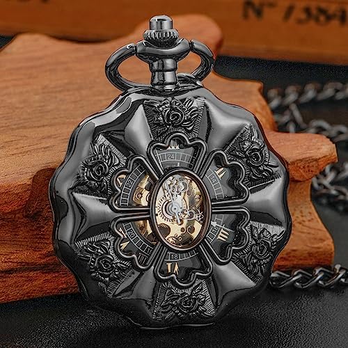 Tiong Black Hollow Hand Wind Mechanical Pocket Watch, Black Dial Blue Roman Numerals Pocket Watches for Men Gifts