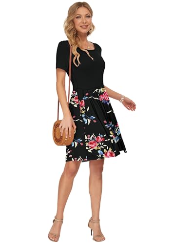AUSELILY Women’s Short Sleeve Pleated Loose Swing Casual Dress with Pockets Knee Length