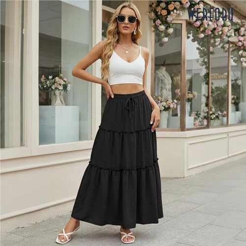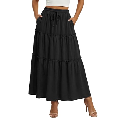 WERFORU Women’s Skirts Elastic High Waist Long Skirt with Pockets Elegant Maxi Skirt for Women A-Line High Waist Boho Skirts