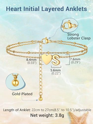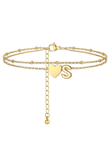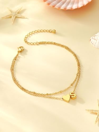 PROSTEEL Women Heart Anklet, A-Z Letter Initial Ankle Bracelet, Adjustable Double-Layer Foot Chain for Beach Summer, Silver/Gold Plated 316L Stainless Steel (with Gift Box)