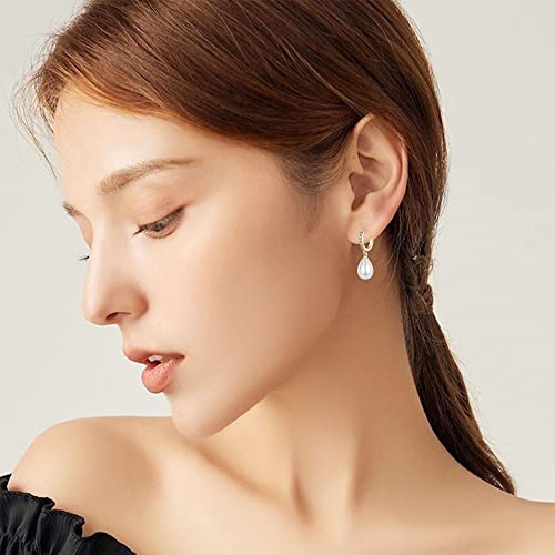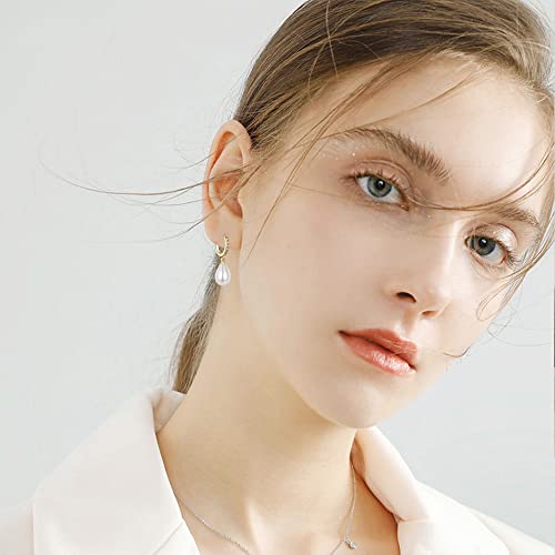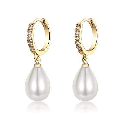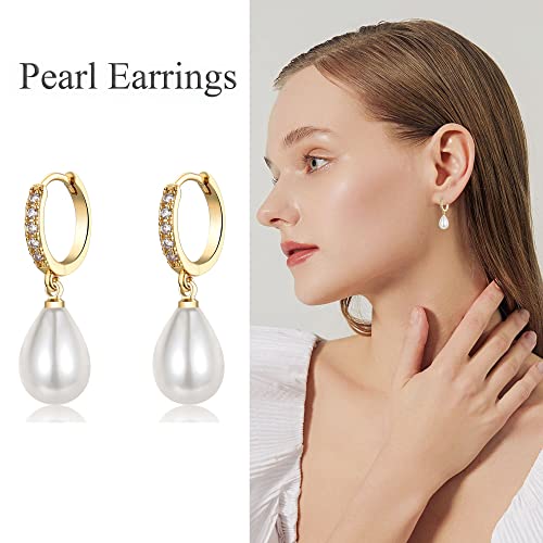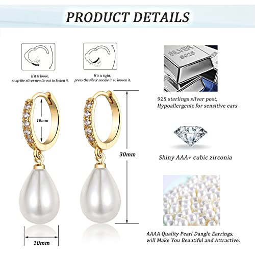 Gold Pearl Earrings for Women, 925 9ct Gold Drop Earrings with Cubic Zirconia│Hypoallergenic Teardrop Pearl Drop Dangle Earring│Jewellery Gift for Women Girls