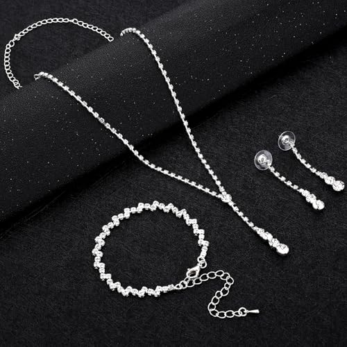 Rhinestone Bridal Jewellery Set Elegant Crystal Teardrop Pendant Necklace Drop Earrings Bracelet Sparkly Silver Jewellery Set for Brides Bridesmaid Women Girls Wedding Costume Accessories