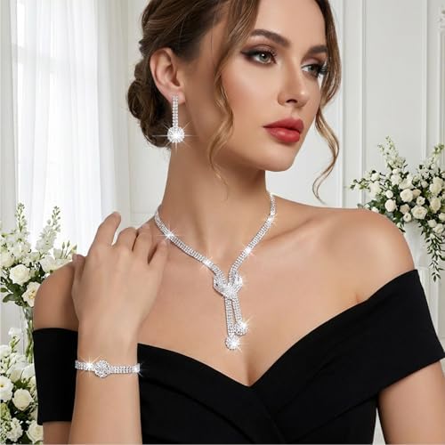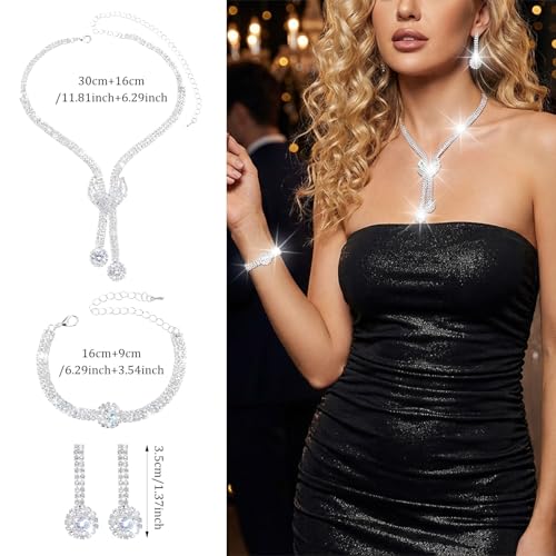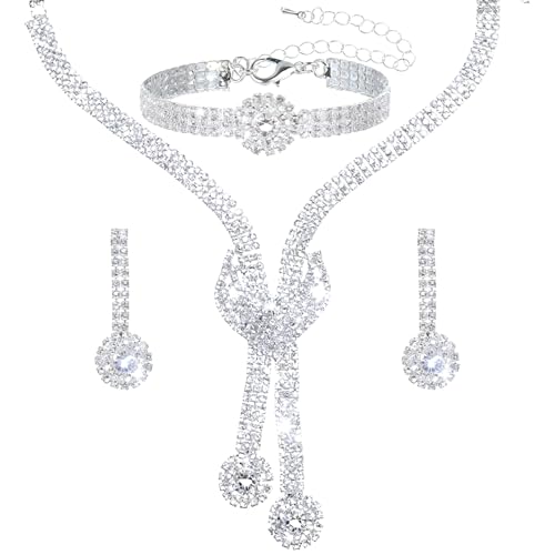 Rhinestone Silver Jewellery Set Crystal Necklace Drop Dangle Earrings Bracelet Set Bling Wedding Formal Costume Jewellery for Women and Brides