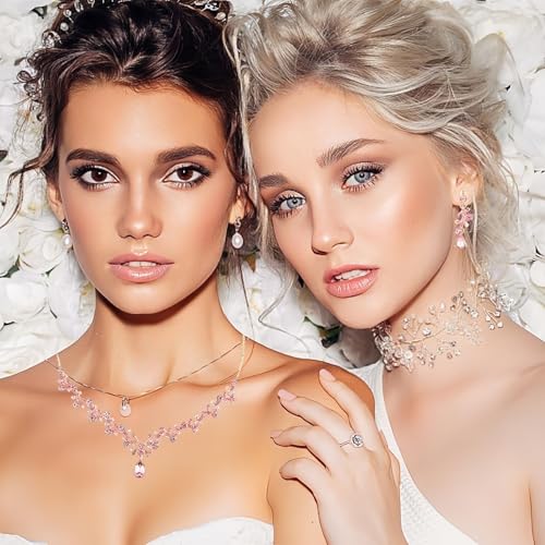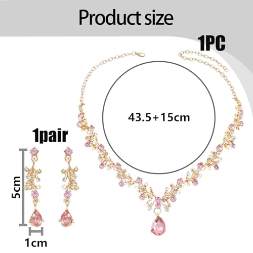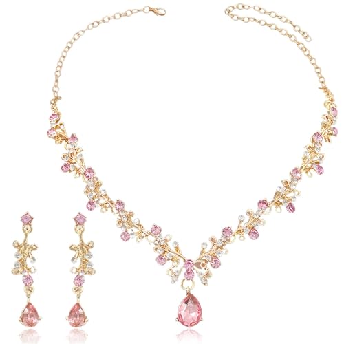 Rose Gold Jewellery Set, Pink Necklace and Earrings Costume Jewellery for Women, Necklace and Earring Sets for Women, Suitable for Ladies Evening Dresses Brides Jewelry for Womens